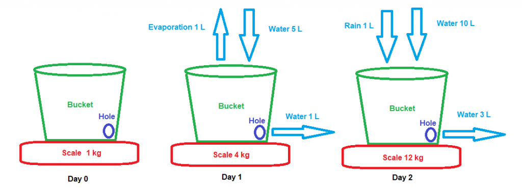 You have a similar bucket to Scenario 2, but now it’s opened to the air. Just like the previous example, the bucket initially weighs 1 kg. You then add 5L of water to the bucket and also lose 1L of water from the bucket because of the hole. However, you now also lose 1L because of water evaporating from the bucket. When you measure the bucket, it now gives you 4 kg. If you then add 10L water, lose 3L you changed the size of the hole and it rains, filling the bucket up by 1L, measuring the bucket will then give you 12 kg.