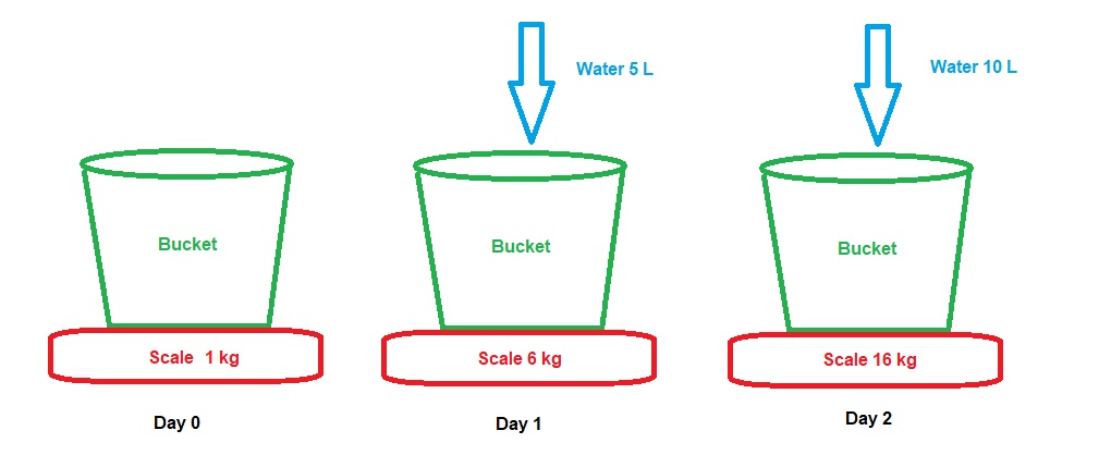 You have an empty bucket that is 1 kg. On Day 1, you fill the bucket with 5L of water then measure the weight of the bucket. The bucket now reads 6 kg. On Day 2, you fill the bucket with 10L of water. You then measure the bucket. The bucket now reads 16 kg.