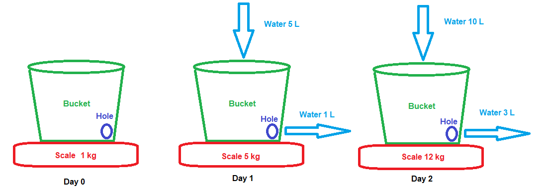 You have a similar bucket to Scenario 1, but with a small hole on the side of the bucket that we can change. When you weight the empty bucket you get 1 kg. You then add 5L of water to the bucket and also lose 1L of water from the bucket because of the hole. If you measure the bucket, you will get 5 kg. If you then add 10L and lose 3L because you changed the size of the hole, measuring the bucket then gives you 12 kg.